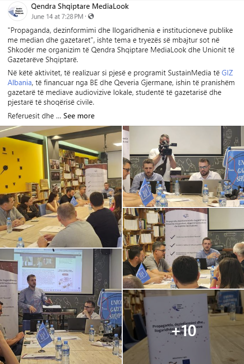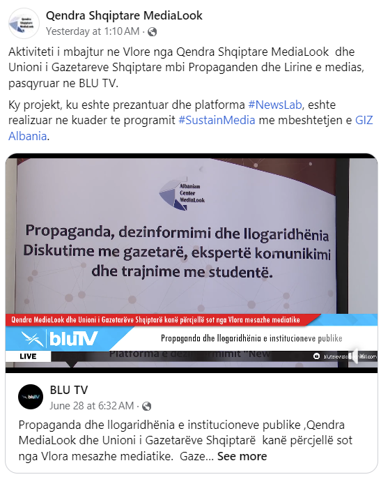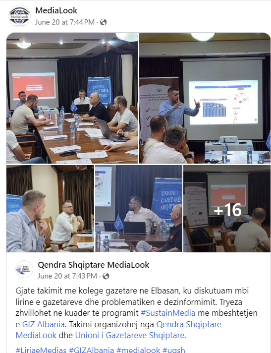 Kontenti që është ndarë në këtë faqe prej disa javësh ka qenë informacioni dhe kronikat e televizioneve lokale mbi një seri takimesh e tryezash që Qendra MediaLook dhe Unioni i Gazetarëve Shqiptarë kanë mbajtur në Shkodër, Elbasan dhe Vlorë për të diskutuar mbi “Propagandën, format e dezinformimit dhe llogaridhënien e pushtetit qendror e lokal”, në kuadër të programit #SustainMedia, me mbështetje të Giz Albania. Më herët një trajnim është mbajtur edhe me studentët e në Universitetin e Tiranës.